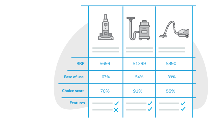 We give each vacuum cleaner a CHOICE score made up of: