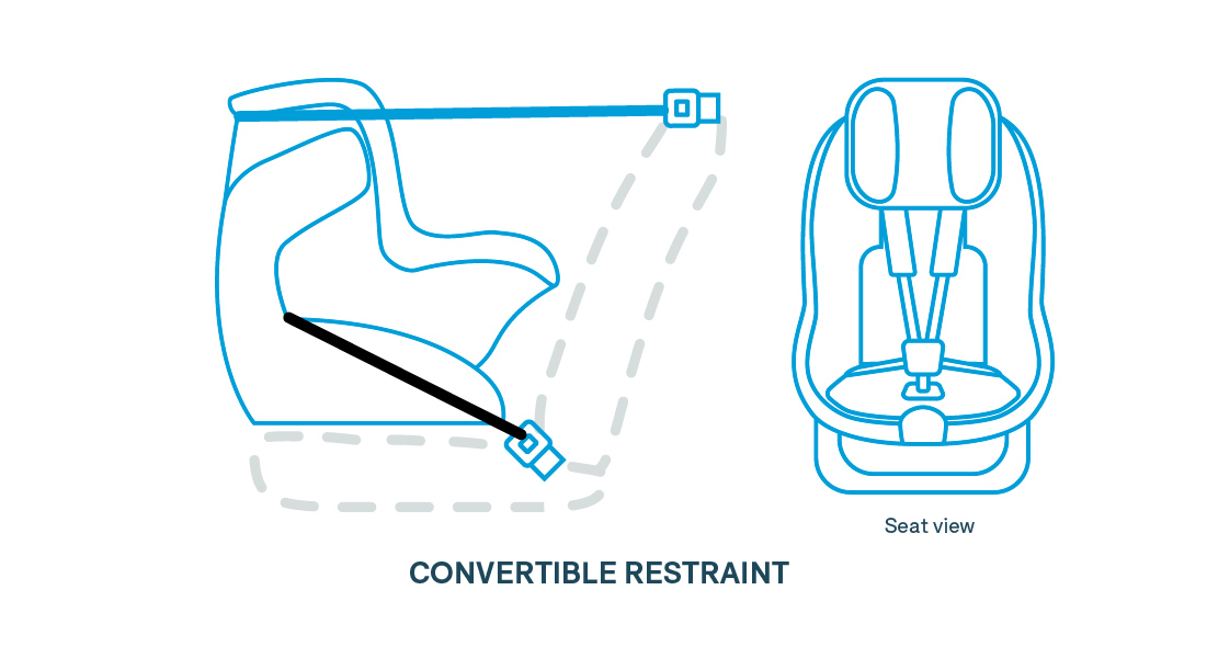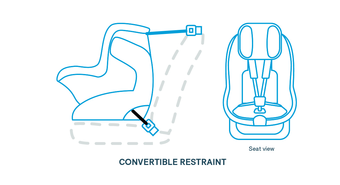 A forward-facing (or front-facing) restraint has its own inbuilt six-point harness for your child. This should be used until your child is at least four years old, but can be used for longer. It’s safer for kids to stay in a harness for as long as they can fit in it.