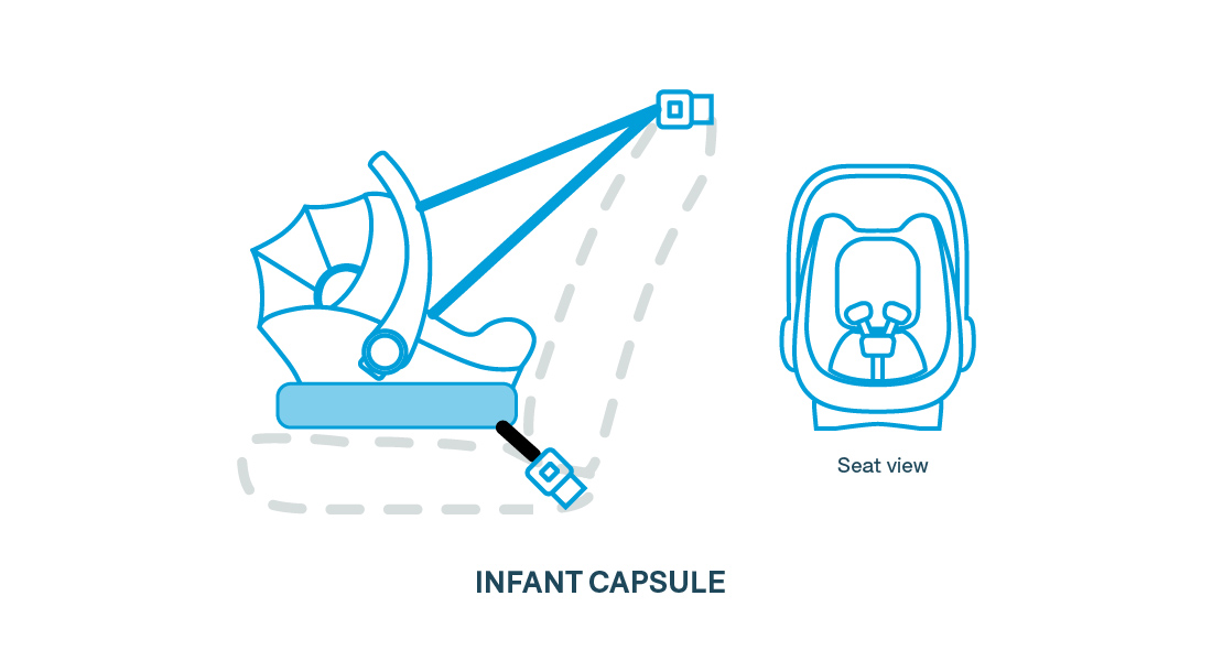 • Children must be seated in a rear-facing car seat or infant capsule.