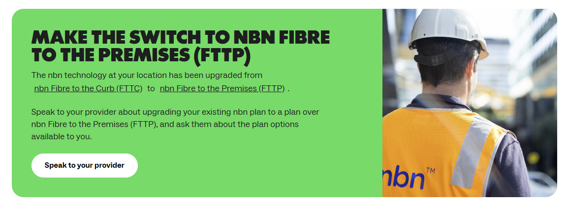 First, find out if your property can convert to fibre. Go to the NBN address checker then enter your address and click “Check residential”. Eligible properties should see a green box that says “Make the switch to NBN Fibre to the Premises (FTTP)”. If that’s not there, you’re stuck with your current setup for the time being.