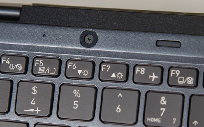 There are two cameras: one is a webcam with infrared, to support facial recognition login; the other is mounted just above the keyboard, pointing up in laptop mode. This can also be used to take photos when in tablet mode.