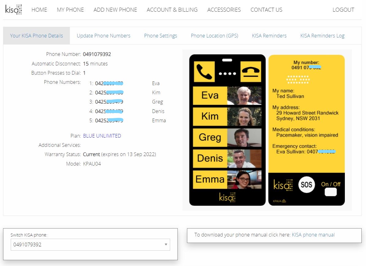 The numbers associated with the buttons are set with the initial purchase but can be changed later using an admin page called MyKisa. Here, the operator (usually the caregiver rather than the user) can change the contact numbers, as well as other settings such as call limits, which ensure that a call doesn’t accidentally go on for hours, and setting an SOS contact number.