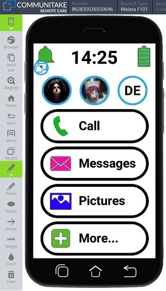The main screen presents large icons indicating the ring volume and battery level as well as the time across the top of the display. Three photo icons (you can choose the photos) showing the most important people to call allow for easy, single-touch access.