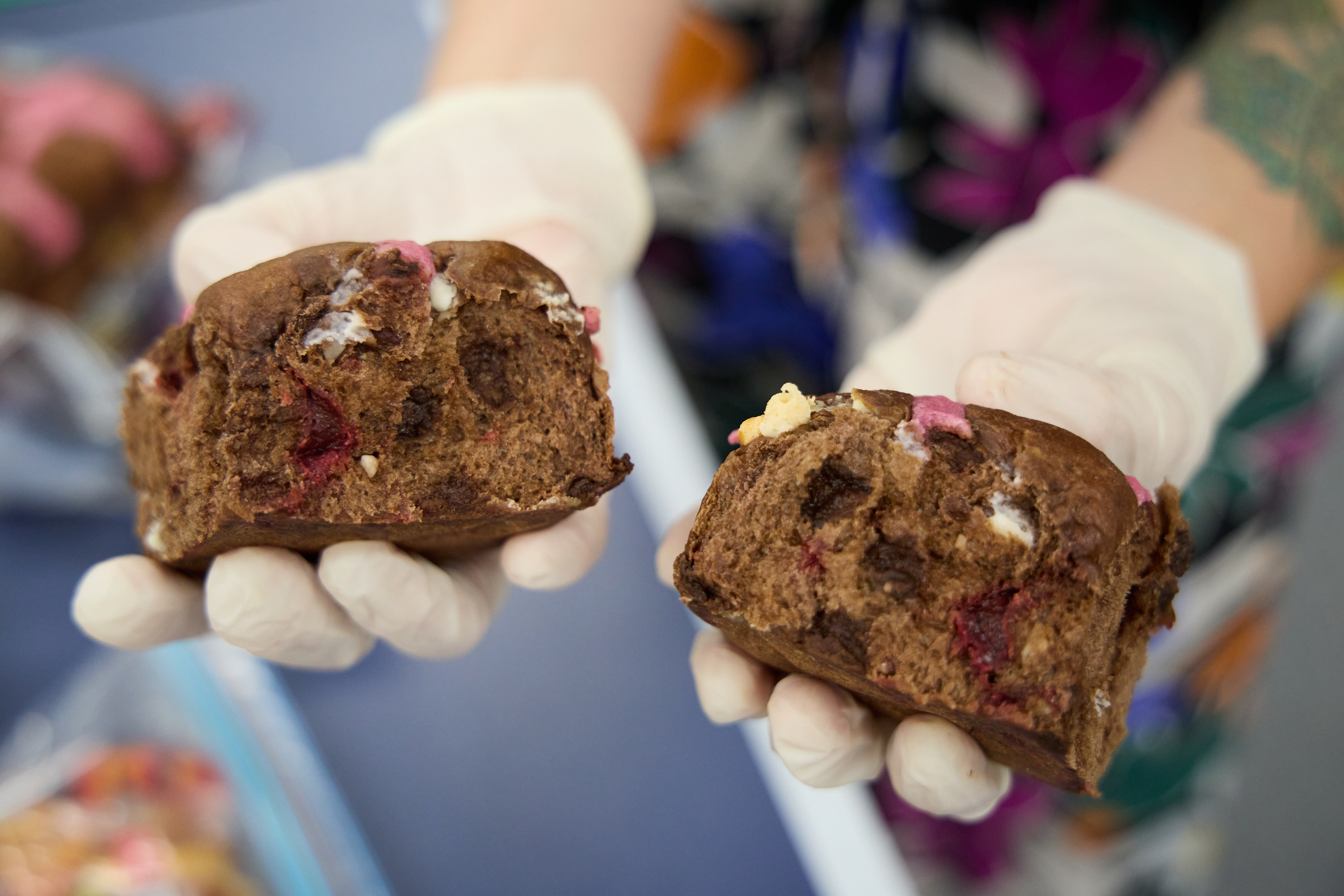 “Inspired by the flavours of a raspberry matcha latte these hot cross buns are flavoured with matcha green tea and packed with creamy white chocolate chips and raspberry flavoured fudge pieces.”