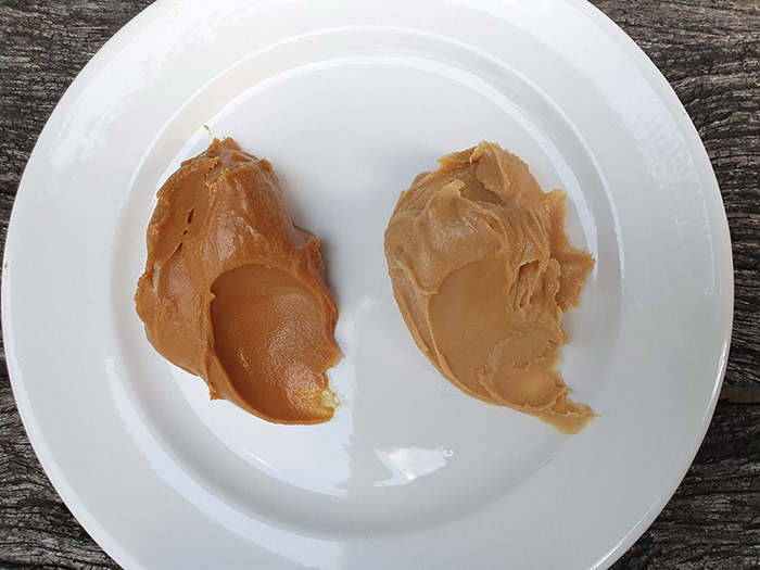 It’s similar in colour, although on the darker end of the peanut-butter-brown spectrum. The paste spreads like peanut butter, and just like peanut butter, it has a stick-to-the-roof-of-your-mouth consistency. But does it taste “just like peanut butter!”, as the label exclaims? My family gave it a trial run.