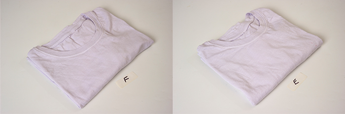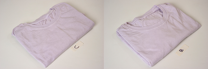 Hopes were high, but the shirt in the unprotected wash and the shirt washed with almost half a box of sheets both came out lilac (albeit a lighter shade than in the first trial). This time there was even less of a difference between the two shirts, with two thirds of those surveyed unable to perceive any difference between them.