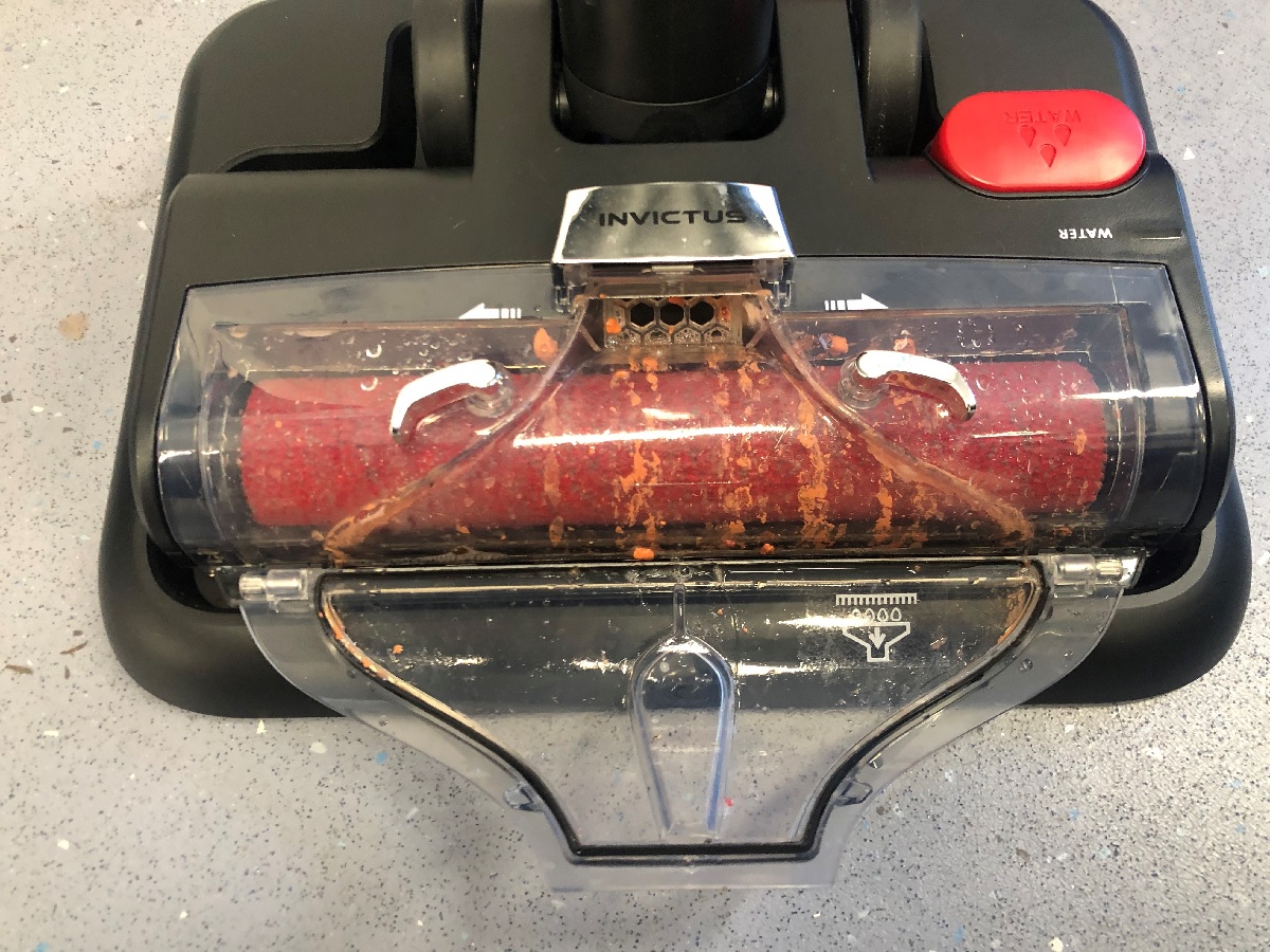 A spinning brush roll combines with the water to suck up spills, which then go into a dirty water compartment. That’s all fine until you realise you need to rinse off the brush roll on the supplied cleaning tray. And then you have to empty the dirty water from the tanks.