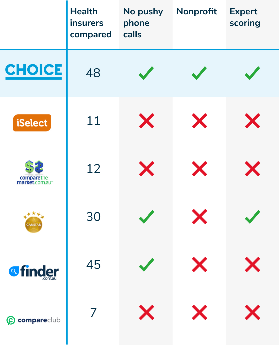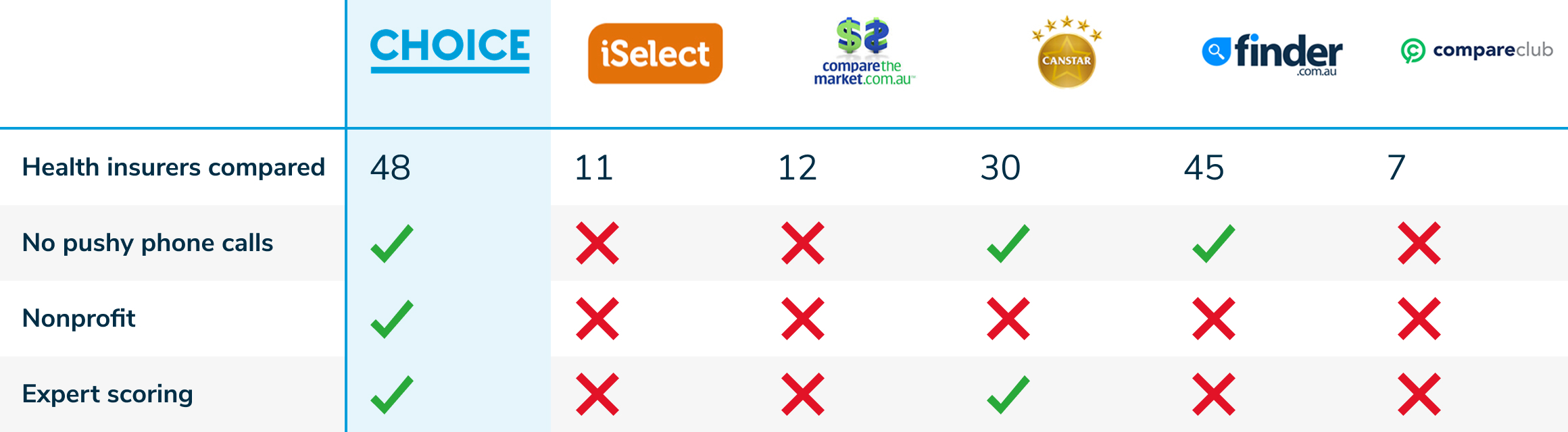 How is CHOICE different? Well for a start, we don’t take commissions from health insurers. You pay us directly to search widely and apply our expert scoring so that we find you the best-value policies that match your needs.